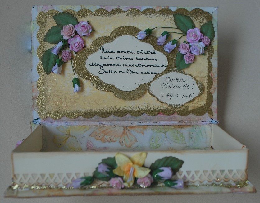 Tyttömäinen juttu totesi parempi puoliskoni ja totesi sitten, että miksipä ei :) Sisällökseen rasia sai kesäisen helmeilykorun.